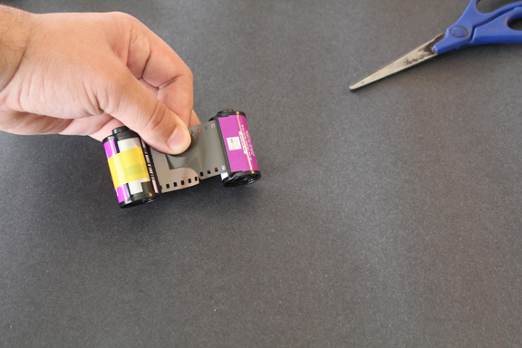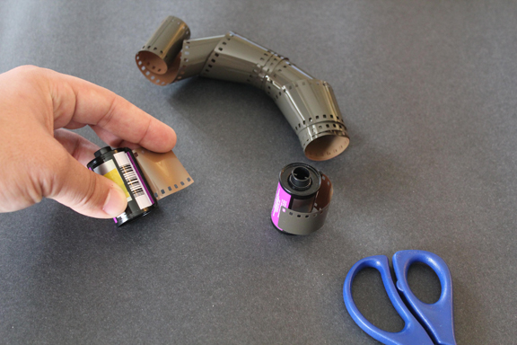 2. Cut the film out of the sacrificed canister but leave about 1 inch of material behind (save the “unusable” film you just cut, I’ll show you something cool you can do with it later).