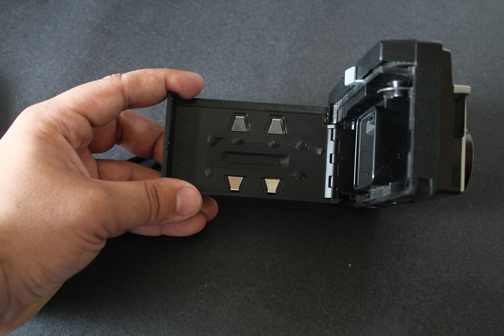 I cut a slot in the plastic that enables the instamatic pickup to grab onto it. As mentioned before, if your pickup is in a “plus” shape, simply cut another slot. The older instamatics (104) have no slot in the centre so to get them to work you would have use friction. The 35mm cartridge will not fit, so you need to sand the top down just a bit and use a little force to get it in there. If it’s tight, it will work just fine.