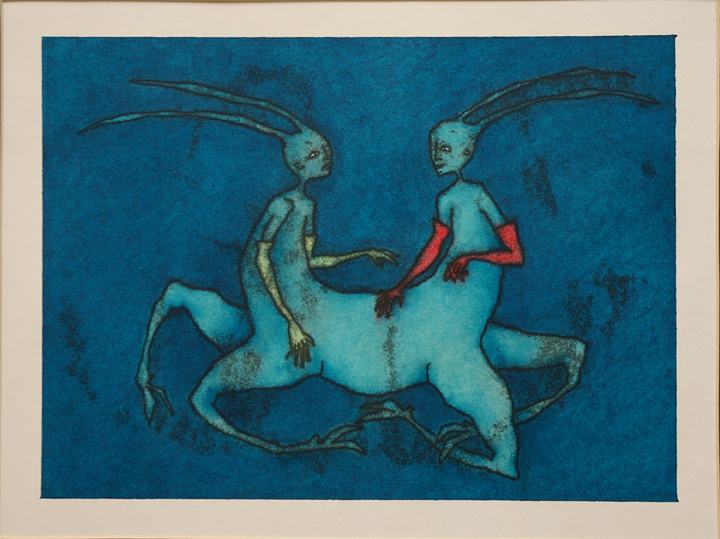 Artist’s Statement: “I would say this is more of a singular piece––part of a small series. It’s experimental; I had never done any print making. It was more of an exploration. It’s not entirely serious. I like playing with idea of animal and people combinations, which you get a lot of in Greek mythology and things like that. We’re all of two minds and fighting temptation, our conscience is always telling us what to do––there’s always a battle in there. The idea is two siamese [sic] twins; what if you had a siamese[sic] twin that you couldn’t stand, and what if you born in a situation where you were attached to somebody and you didn’t like each other? It’s purgatory! This is kind of a push and pull/yin and yang kind of thing.