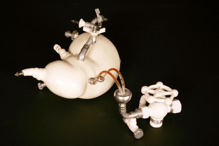 Artist’s Statement: “I have several [industrial organs], this is just one organic-industrial organ. This is very new, the first I have submitted. I tried to show that industrial and high-technology goes into everything in our daily life; no matter where we go, we see high-tech [things] and industrialization. That’s why I think, one day, it will go inside our bodies. Our organs might become very high-tech — it might come true. It’s kind of ironic; it’s kind of like a joke. All of my work has an element of humour, but under my humour it’s always concerned with some serious issues. For example, my organ is serious. I started my Industrial Organ projects is 2007 for my Emily Carr grad show. That organ, though, is totally different. They are made from the same mold, I have several molds. This one is cast from a mold. The first few organs I made were transparent with lights inside. In 2008, I had an organ installation at the Richmond Art Gallery. I made 500 pieces of different organs, so that was a huge installation. So I make many, many small molds and I fabricate them and compose them and try to convey the industrial theme.”