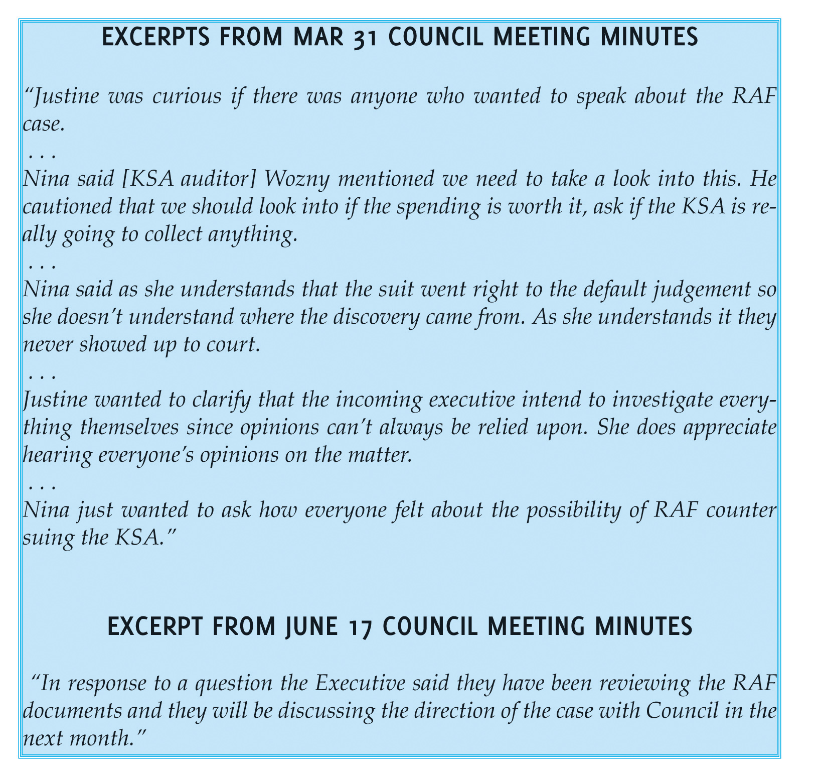 At an Aug. 17 meeting the KSA council took steps to deal with the “appearance of a possible conflict” by passing a motion. The motion upheld the earlier April 1 decision of the executive board to fire lawyer David Borins and “to cease all activity pertaining to the RAF case until further notice.” It was a near-exact copy of the original motion initially moved by Nina Sandhu that stopped action on the case in April. The main difference being that the new motion specifically noted that Franson and Sandhu “have had no involvement in this decision making process.” This time however, Franson and Sandhu left the room before the vote.