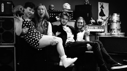 Thee AHs – guitarist Sarah Lowenbot, lead vocalist Davina Shell, drummer Marissa Holmes, and bass player Ridley Bishop – are all well under the age of twenty-five, and they sound like it. They perform wearing heart-shaped sunglasses.