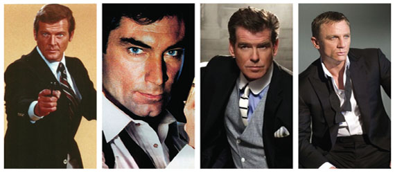 (Left to right) Bond through the years: Roger Moore, Timothy Dalton, Pierce Brosnan, Daniel Craig.
