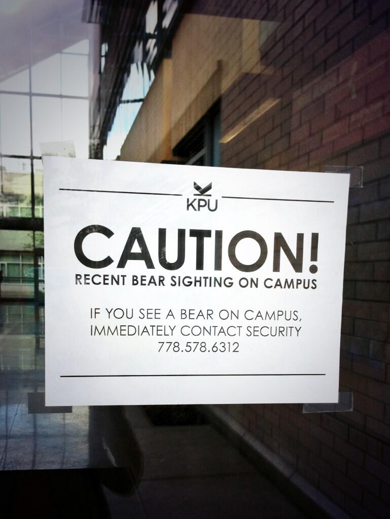 Students should not be concerned for their safety, but should be aware that the bear was easily frightened. Students are urged to remain calm and not approach the bear if it returns. Instead, students should immediately contact campus security at 778-578-6312.