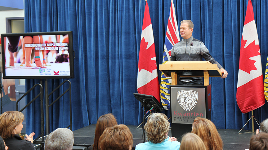 The Chip and Shannon Wilson School of Design, a 4,900-square metre facility at KPU’s Richmond campus began construction in December 2013. The building will include teaching studios, testing and prototype labs, student study spaces, a materials research center and gallery space. It is a $36-million project with Chip and Shannon Wilson of Lululemon Athletica contributing $8 million to the cause, and their company pitching in another $4 million. Kwantlen Polytechnic University and the province of B.C. are the two other investors in the project.